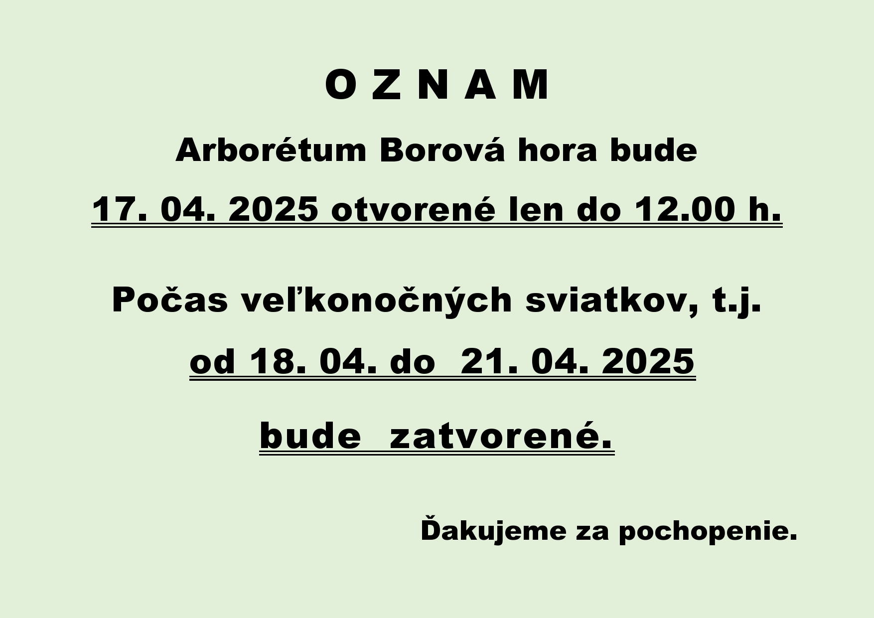 Arborétum Borová hora bude dňa 17.04.2025 OTVORENÉ len do 12.00 hod.