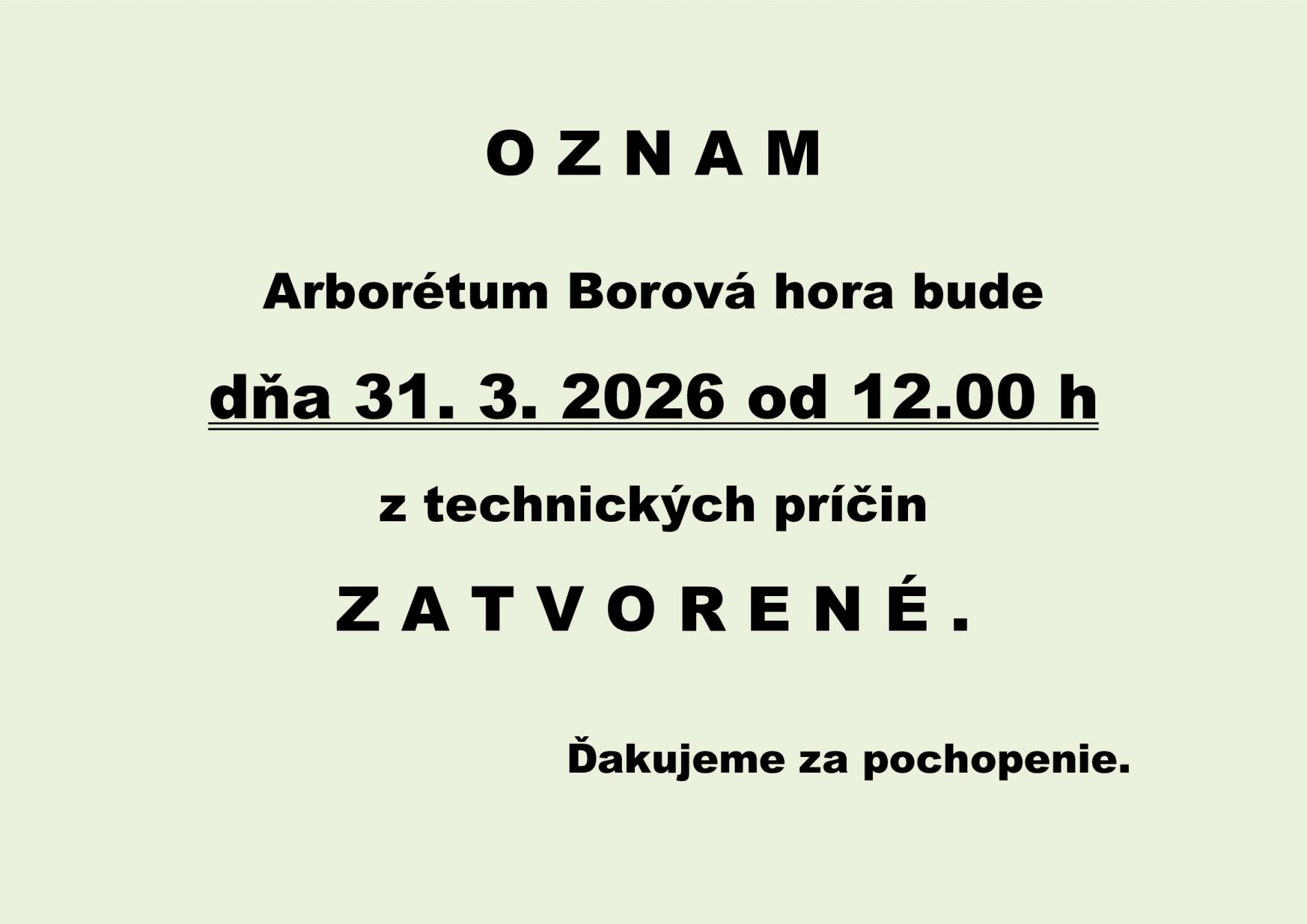 Oznamujeme návštevníkom, že dňa 31.03.2026 od 12.00 hod. bude Arborétum Borová hora z technických príčin ZATVORENÉ.