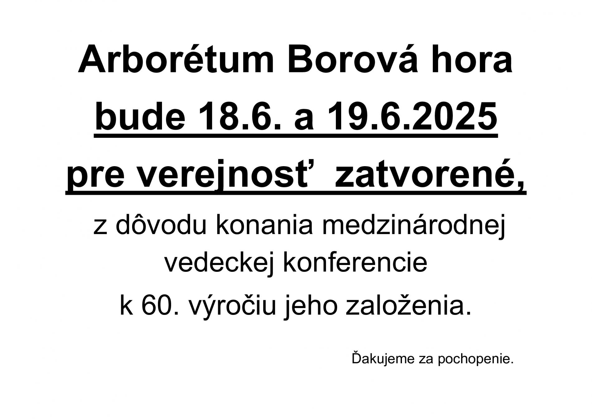 Arborétum Borová hora bude 18.6. a 19.6.2025 pre verejnosť ZATVORENÉ, z dôvodu konania medzinárodnej vedeckej konferencie k 60. výročiu jeho založenia. Ďakujeme za pochopenie.